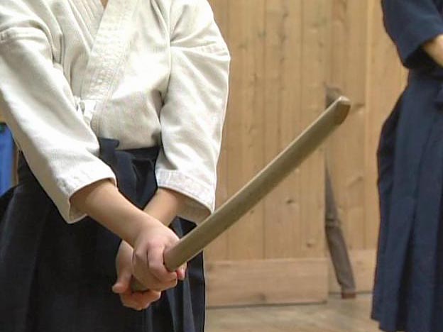 試合の練習もします。試合では、竹でできた刀、竹刀を使います。大きなかけ声を出して、気合いを入れて、試合をします。