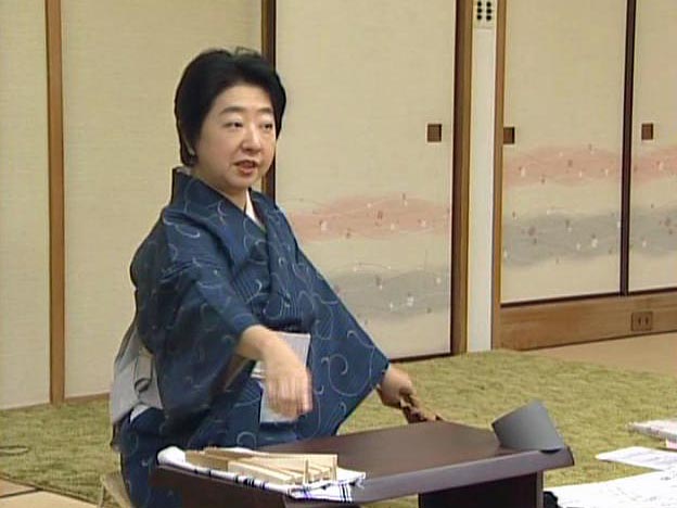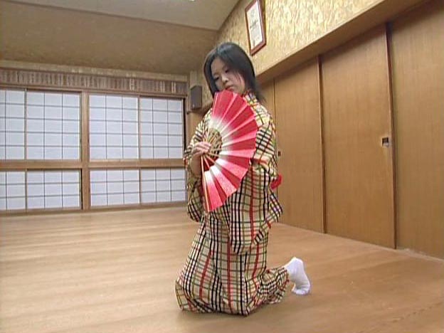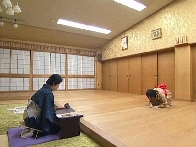 日本舞踊は着物で稽古をします。稽古をはじめるときは、扇子を前に置いて、正座をして、先生におじぎをします。手で三角形を作って指を床につけます。「先生、おねがいいたします」と言います。