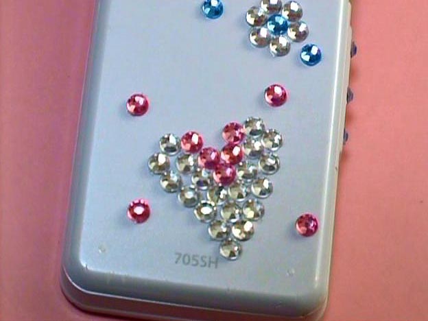 ラインストーンでできた、ハートのマークです。清水さんはとても上手にラインストーンで携帯をかざっています。ラインストーンにはたくさんの色や形があります。