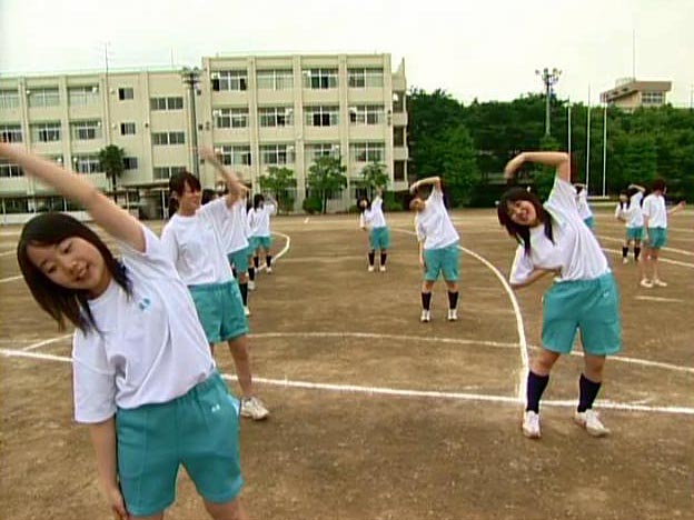 かけ声をかけながら、準備体操をしています。日本には「ラジオ体操」という、誰でも知っている体操があります。みんな、この順番で体操をします。