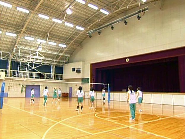 体育館でバレーボールをしています。体育の授業は、グラウンドでするときと、体育館でするときがあります。