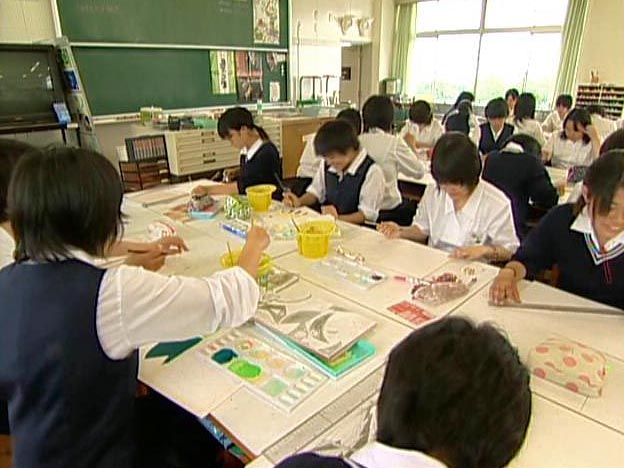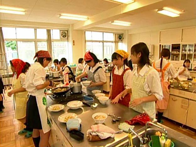家庭科の授業です。料理など、家の仕事について勉強します。料理の授業では、グループに分かれて料理を作って、みんなで食べます。
