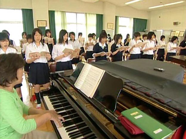 音楽の授業です。先生のピアノにあわせて、みんなで歌います。楽器をえんそうすることもあります。