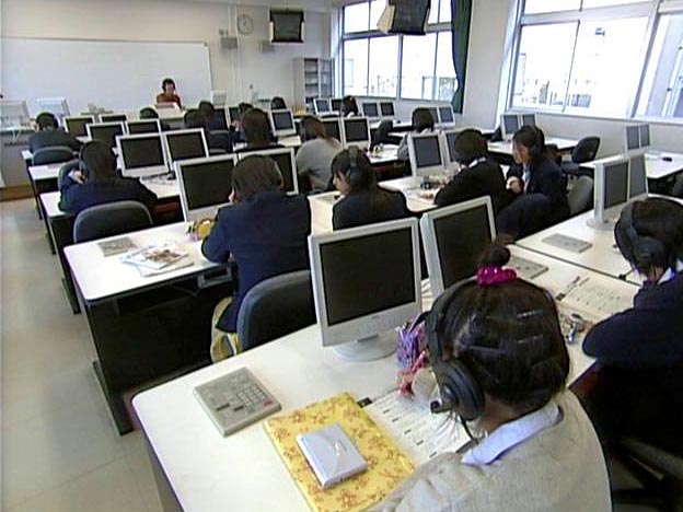 英語の発音の勉強です。ここはCALL教室です。コンピュータなどの機械を使って、外国語を練習します。