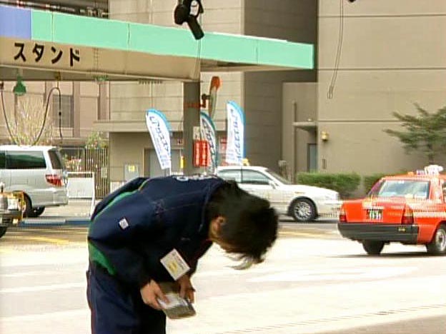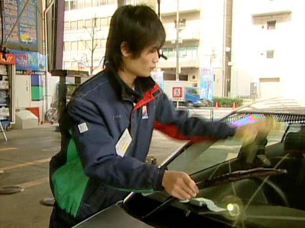 日本のガソリンスタンドでは、店の人がガソリンを入れてくれるのがふつうです。ガソリンを入れている間に窓をふいたり、車の中のゴミを捨てたりもしてくれます。