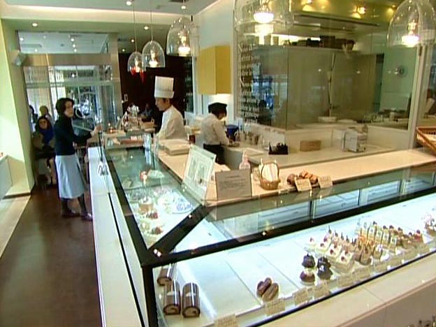 このお店では、店の中でケーキを食べることもできます。袖山さんは、お店で食べる人に、ケーキや飲み物を出す仕事もします。