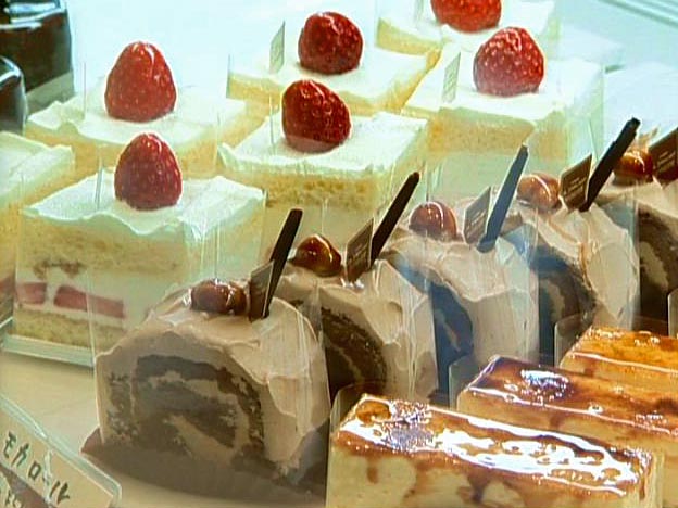 おいしそうなケーキです。いちごののったケーキは、ショートケーキと言います。ケーキ店の人気商品です。