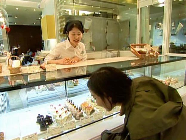 お客さんがショーケースの中のケーキを見て注文します。どのケーキをいくつほしいか伝えます。袖山さんは注文をメモしています。