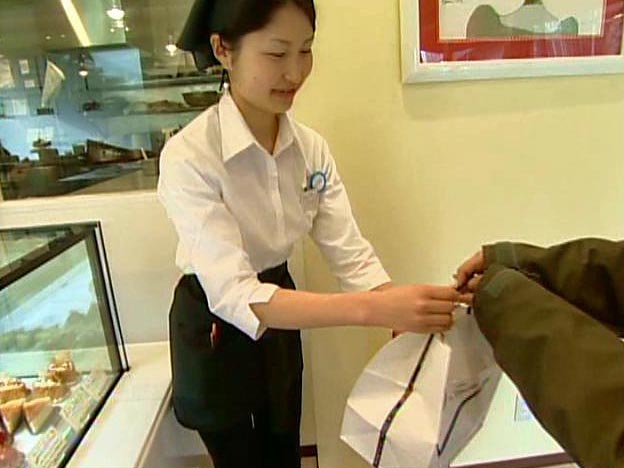ケーキの入った紙袋を、「たいへんお待たせしました」と言って、お客さんにわたします。そして、「ありがとうございました」とおじぎをしながら、お客さんを送ります。