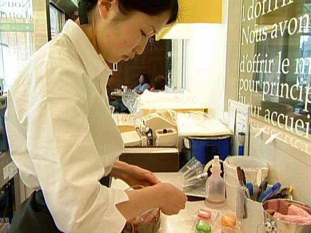 お菓子を袋に入れ、リボンをつけてかざる仕事もあります。袖山さんは吹奏楽をやっていて、フルートを買ったので、そのお金のためにアルバイトしています。お金をお母さんに少しずつ返します。