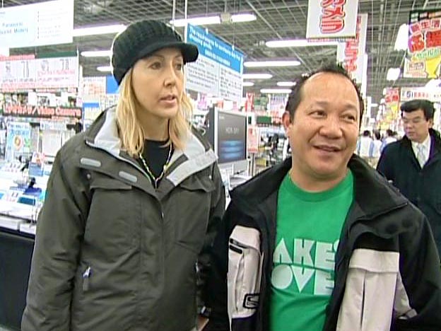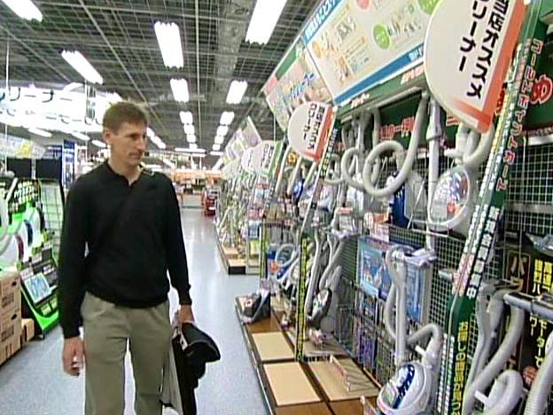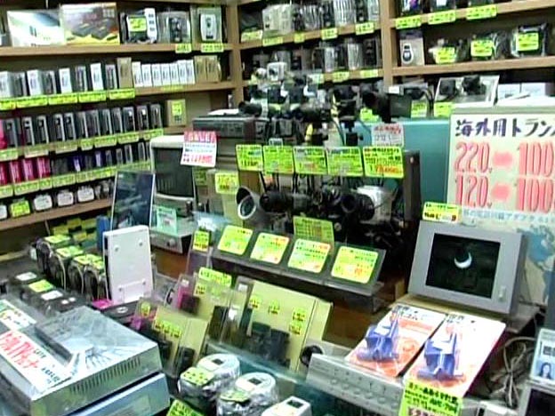 秋葉原は、外国でも有名です。日本の電気製品をおみやげに買いたい外国のお客さんも、たくさん来ます。このお客さんは、お店が大きく品物もたくさんあることにおどろいています。