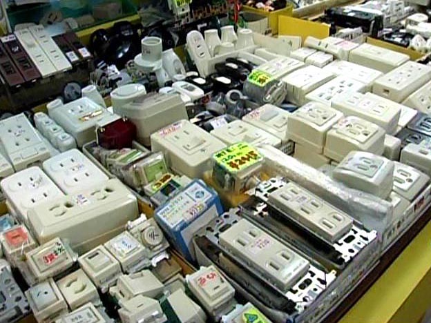 そうじきなど、家庭電気製品も売られています。外国人のお客さんが見に来ています。