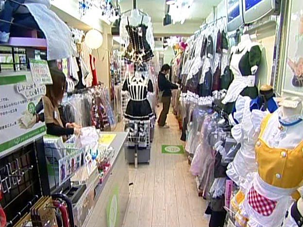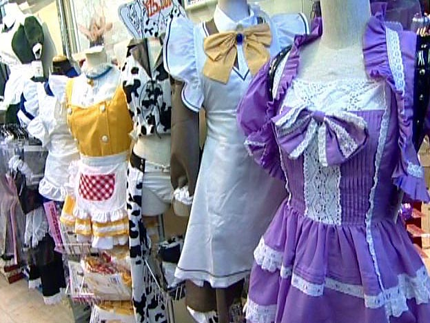 コスプレの服を売るお店です。アニメのキャラクターの服や、メイドの服などが売られています。このような衣装を着ている人は、秋葉原の通りやアニメのイベントで見ることができます。